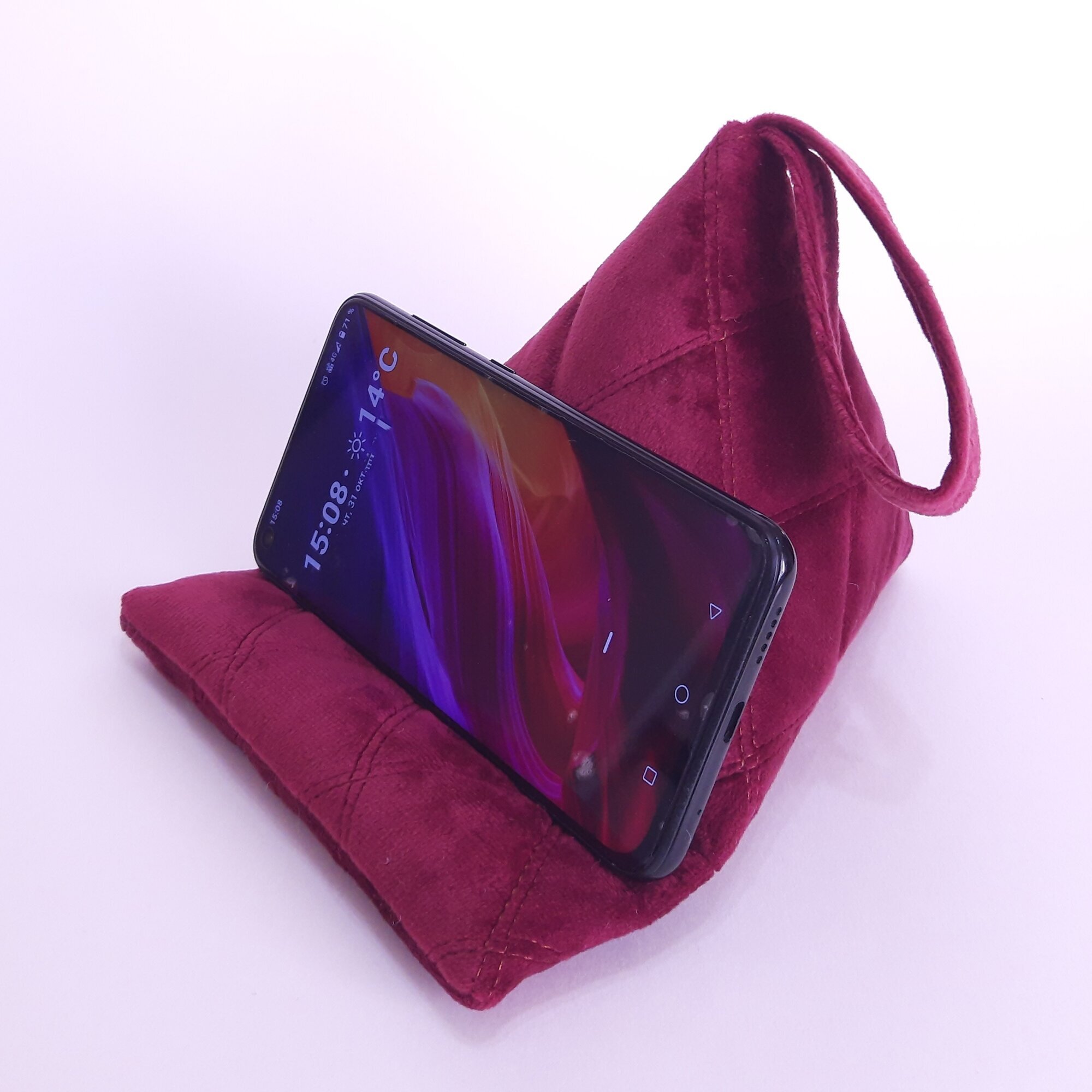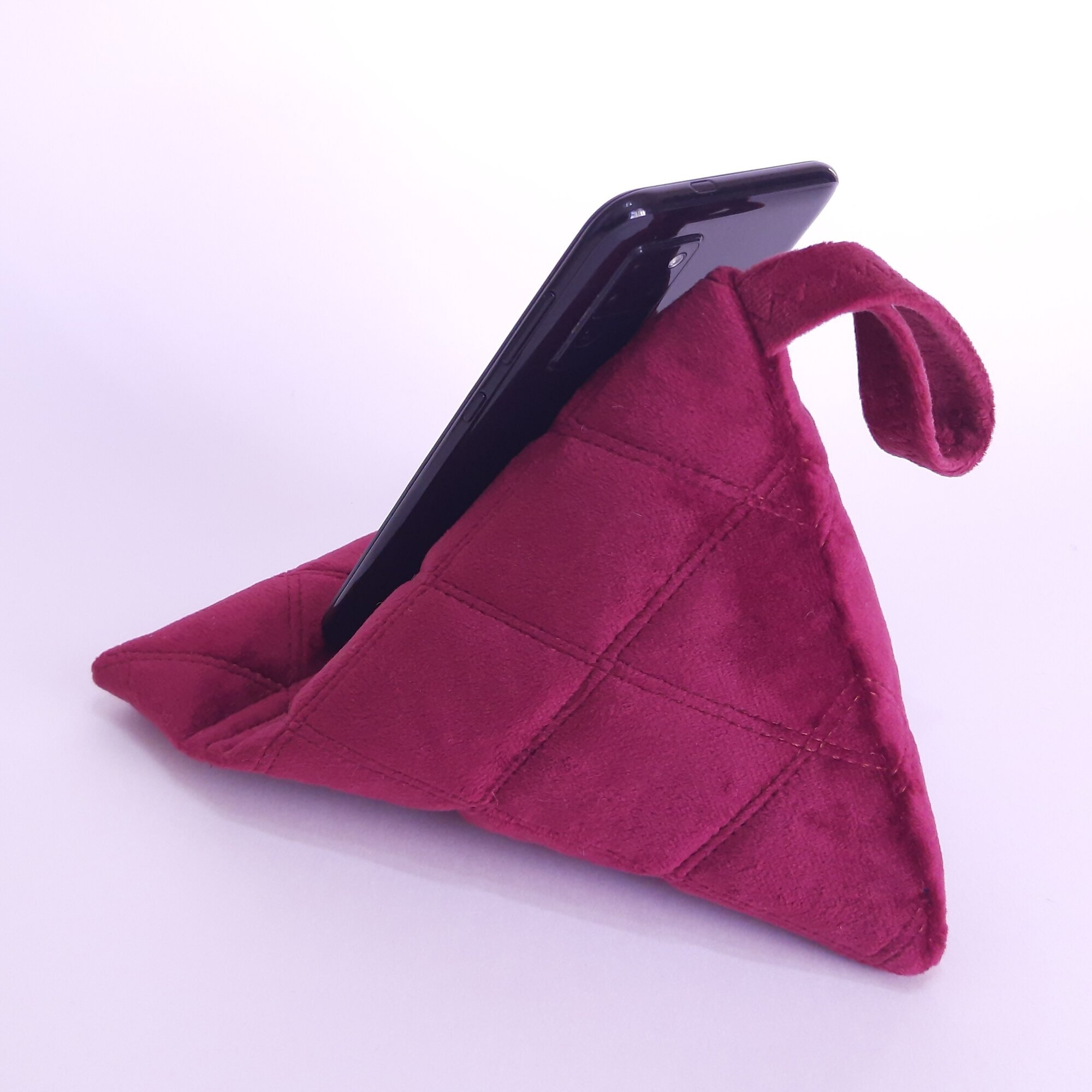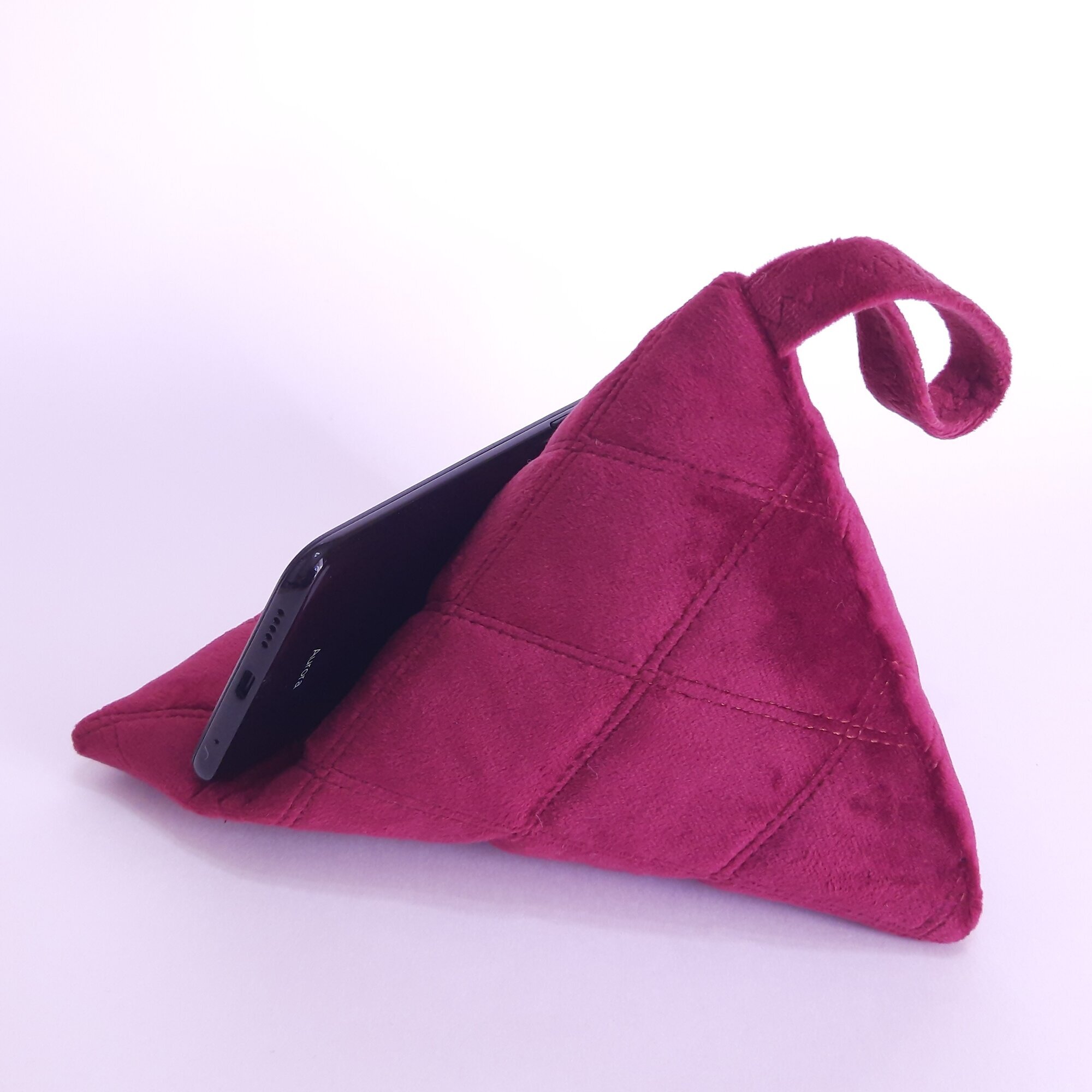 Подставка - подушка для мобильных устройств. Это незаменимый и супер удобный девайс для тех, кто любит делать несколько дел одновременно. Вы можете использовать подставку для просмотра любимы программ, чтения, просмотра веб-страниц или для видеозвонков. Телефон можно разместить горизонтально или вертикально. Сделано вручную, из плотного велюра и синтепона. Есть (внутри) утяжелитель для устойчивости.