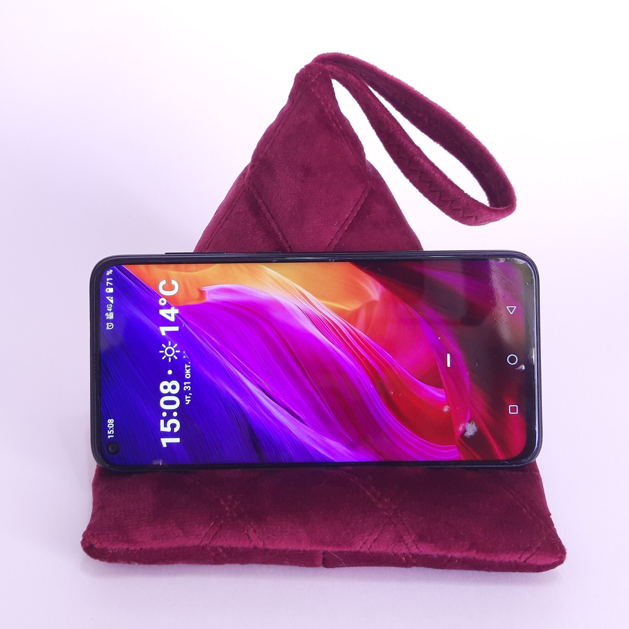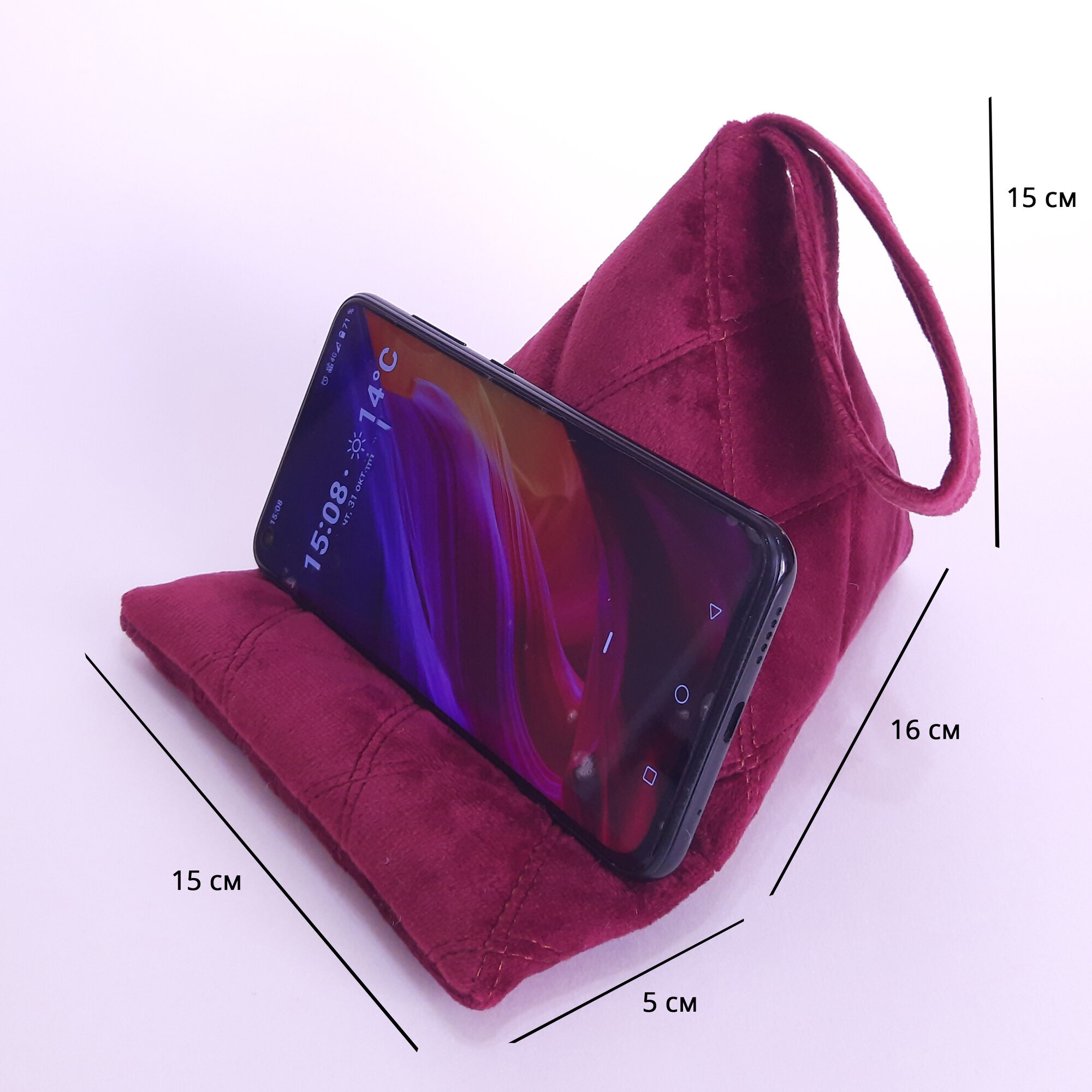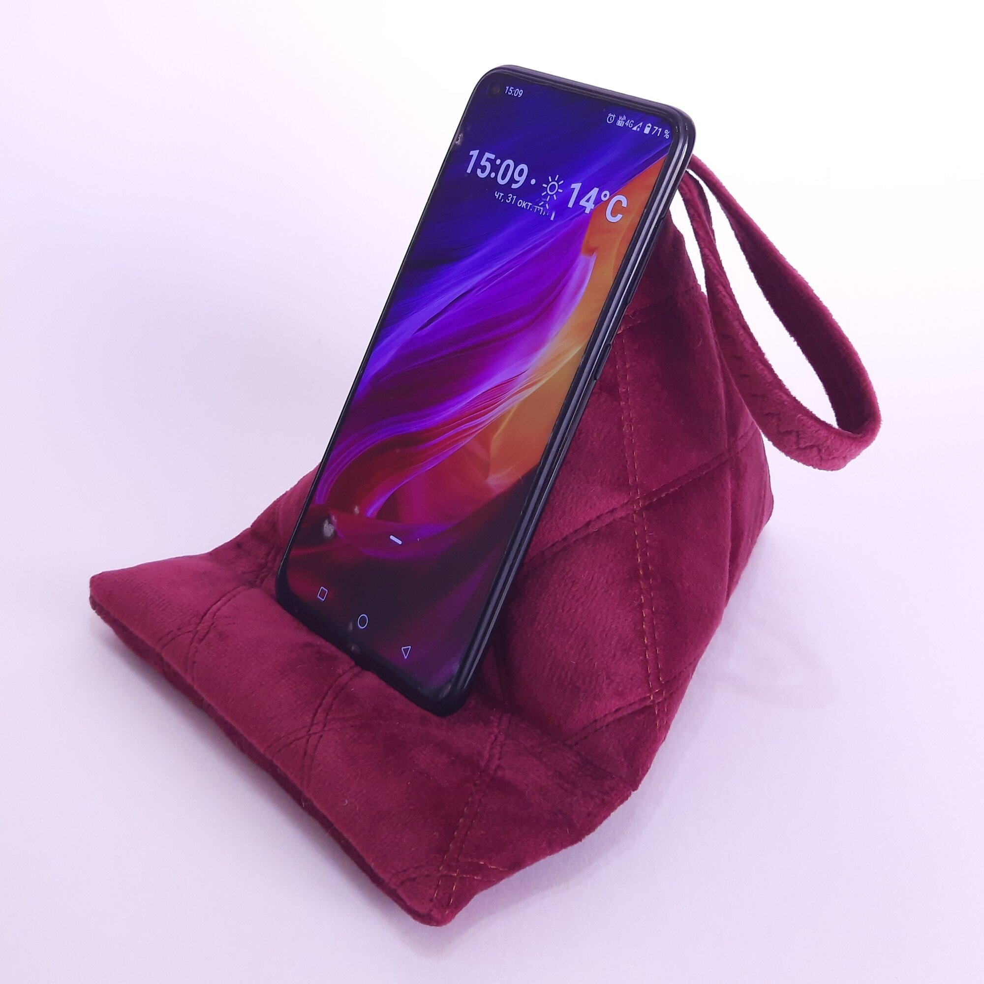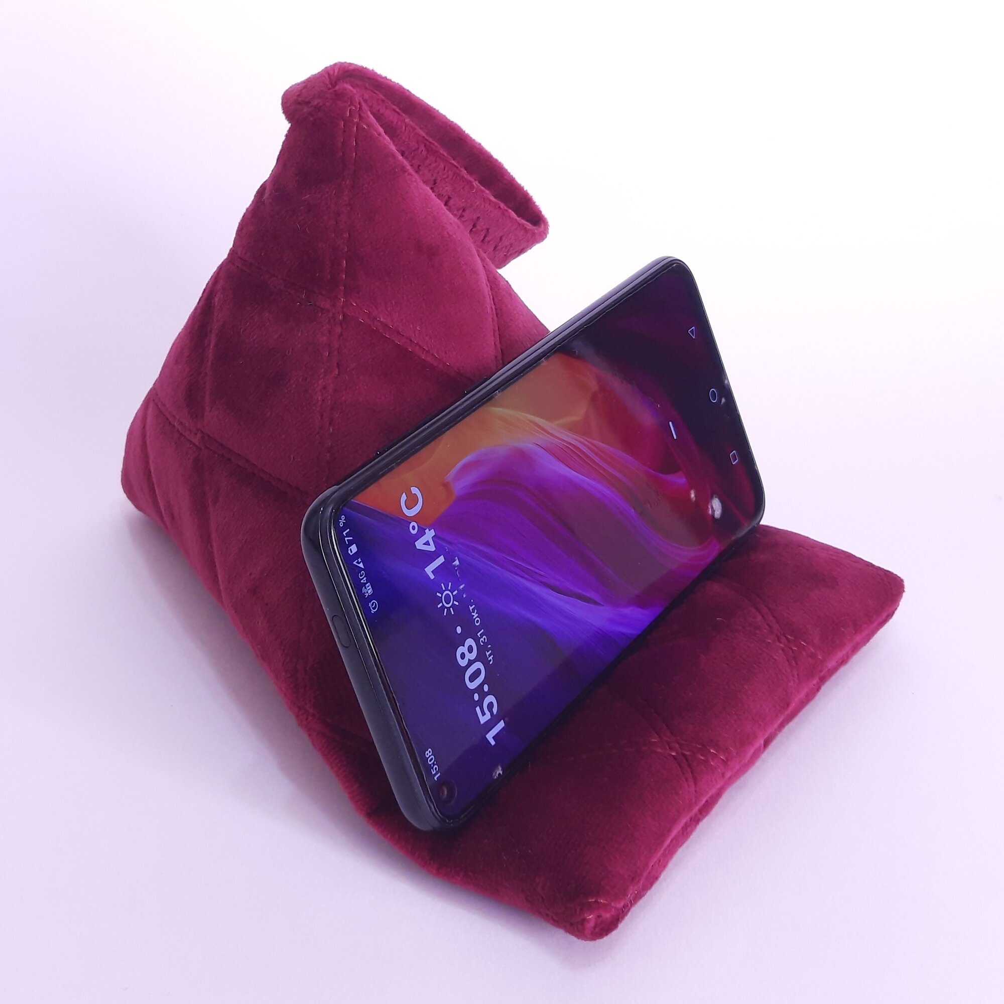 Подставка - подушка для мобильных устройств. Это незаменимый и супер удобный девайс для тех, кто любит делать несколько дел одновременно. Вы можете использовать подставку для просмотра любимы программ, чтения, просмотра веб-страниц или для видеозвонков. Телефон можно разместить горизонтально или вертикально. Сделано вручную, из плотного велюра и синтепона. Есть (внутри) утяжелитель для устойчивости.